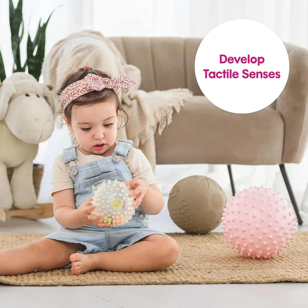 The balls' different sizes, shapes, and textures encourage babies to grasp, squeeze, and roll, helping strengthen hand muscles and coordination. The balls' bounciness also promotes movement, supporting gross motor skill development.