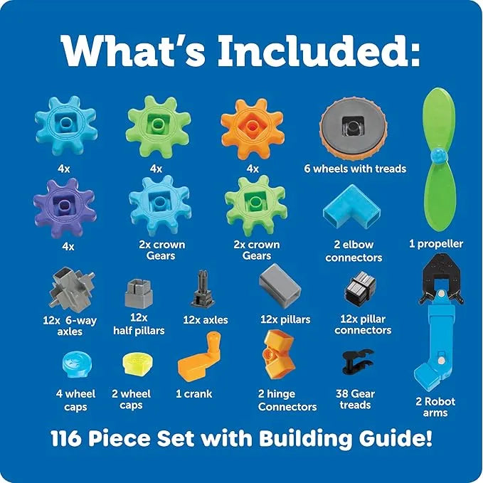 - 116-Piece STEM Construction Set – Includes gears, wheels, connectors, arms, rolling treads, and spinning eyes for limitless creations.