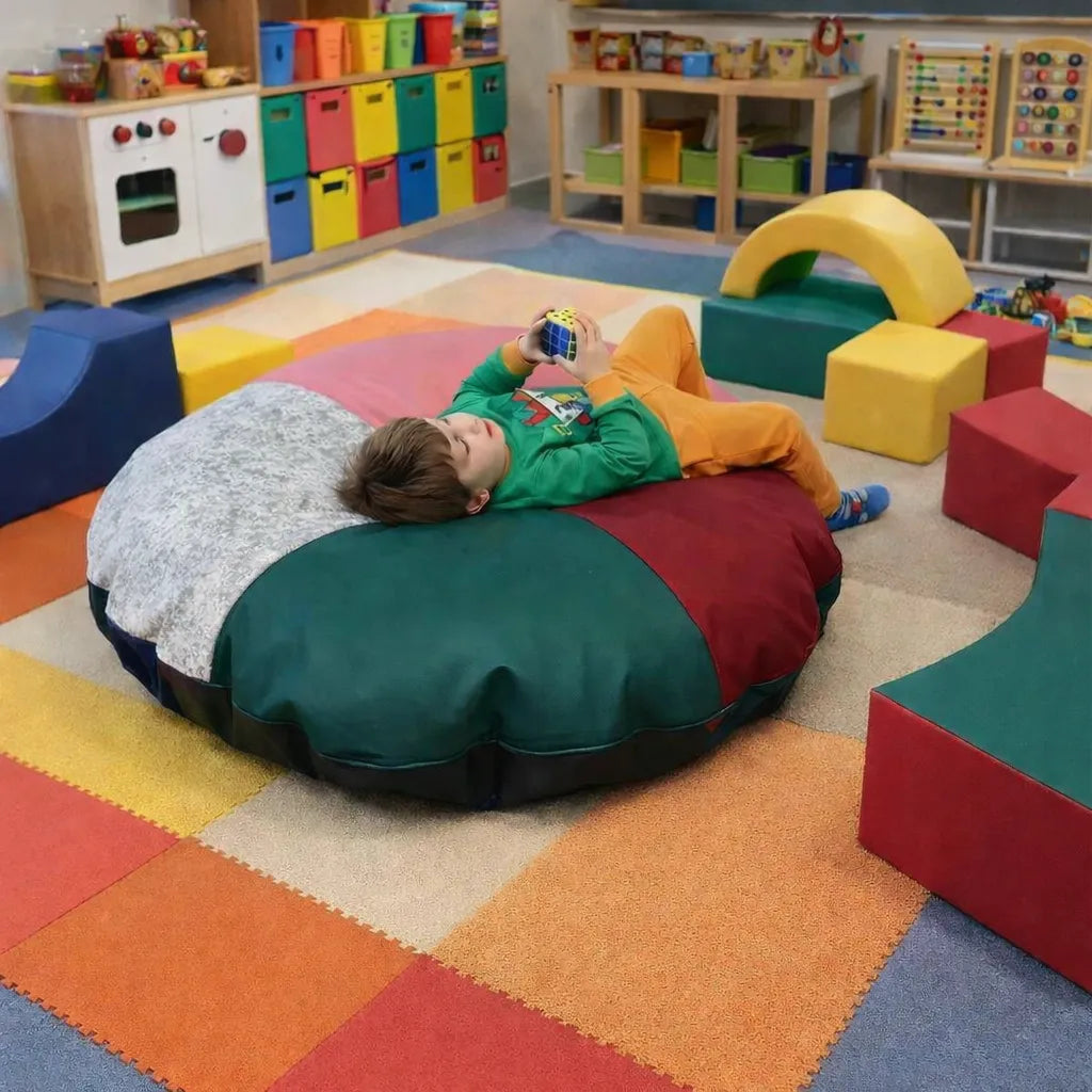The round shape and soft filling allow the beanbag to contour to each user’s body, providing gentle, adaptable support. This moulding effect creates a cocooning feel that encourages relaxation and sensory regulation.