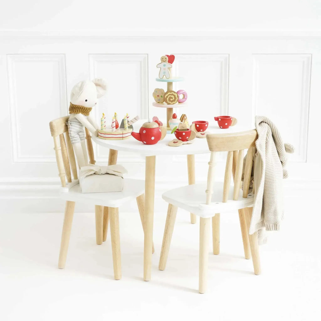 - Wooden table and two chairs set – a perfect fit for any playroom or nursery
