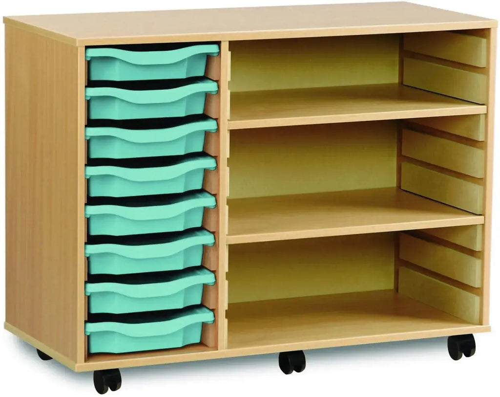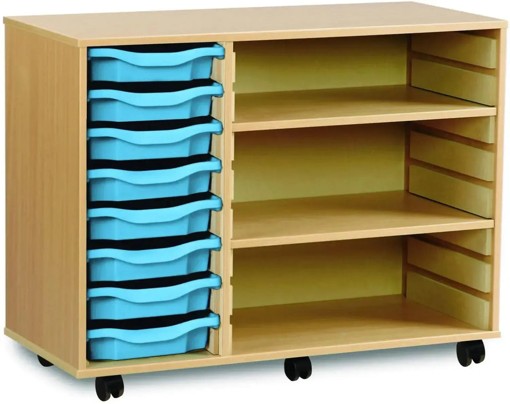 The Monarch 8 Shallow Tray Unit with 2 Adjustable Shelves is an efficient and versatile storage solution, ideal for schools, colleges, and nurseries. Combining tray and shelf storage, this unit is perfect for organising a variety of classroom materials, including stationery, craft supplies, and educational resources, ensuring an efficient and tidy learning environment.
