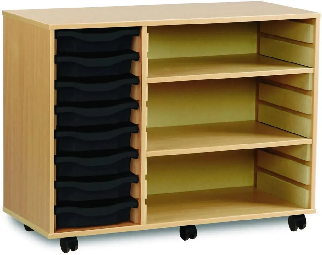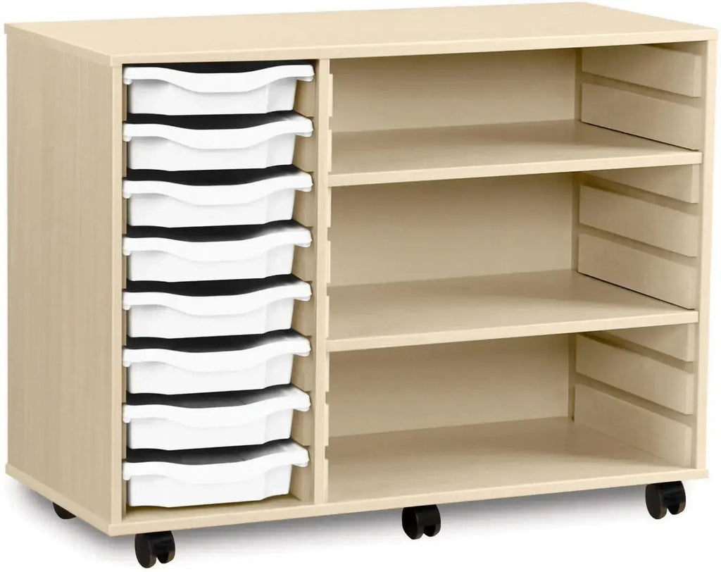 Constructed from durable 18mm MFC, the unit is available with a beech or maple carcass, providing a sleek and professional appearance. It comes equipped with eight shallow trays that can be customised in a range of colours or mixed combinations to suit your preferences. The two adjustable shelves offer flexible storage for larger or bulkier items, making the unit adaptable to a variety of needs.