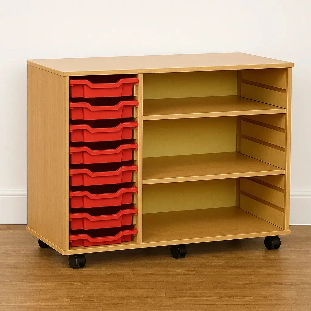 The Monarch 8 Shallow Tray Unit with 2 Adjustable Shelves is a practical and stylish addition to any classroom or office, offering the perfect balance of functionality, flexibility, and durability. Its combination of tray and shelf storage ensures it meets the diverse needs of busy educational environments, making it an essential resource for keeping spaces organised and efficient.