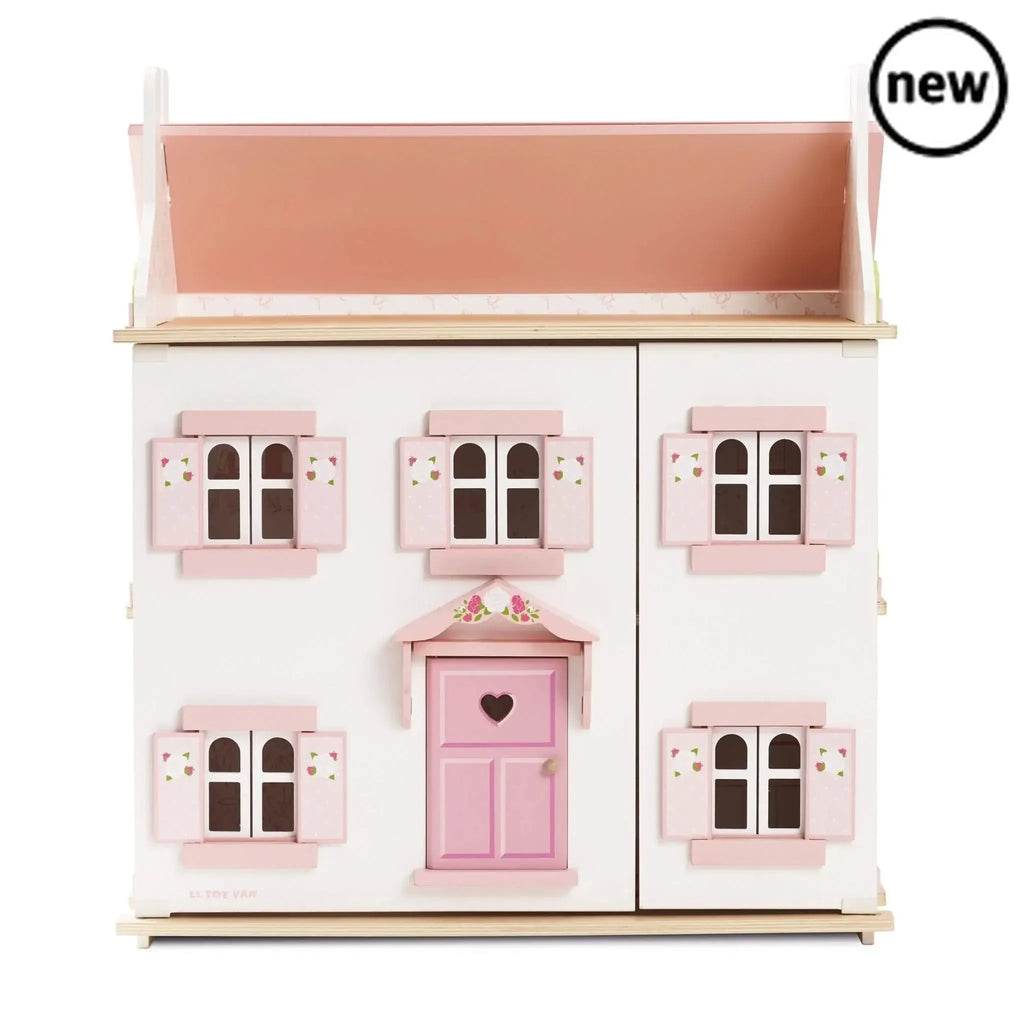Painted in soft pastel pink and fresh whites, this delightful wooden dolls house features opening and closing windows and shutters, each adorned with a delicate floral motif. A cute front porch adds a welcoming touch, inviting little guests into a magical world of role-play fun.