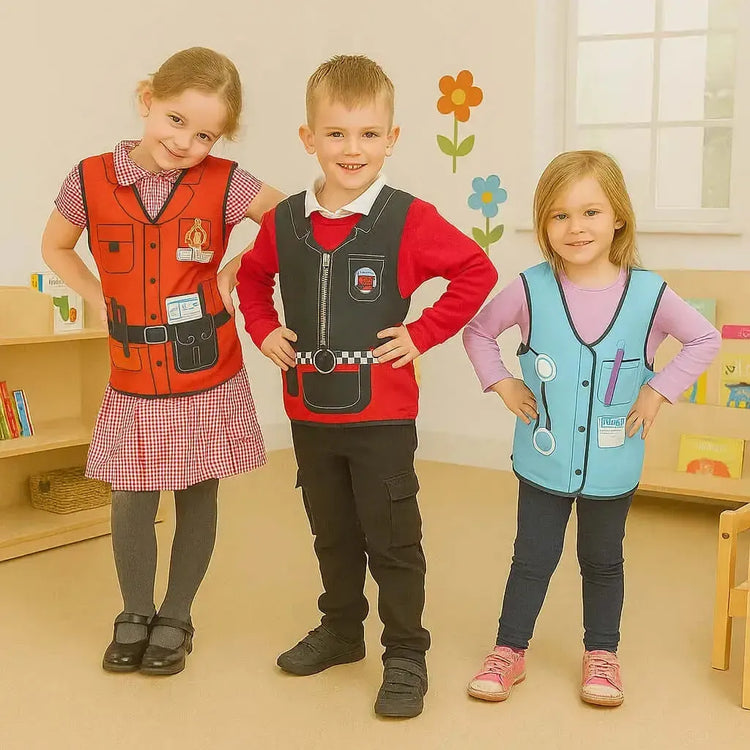 Includes six colourful tabards representing real-world professions: firefighter, doctor, postie, surgeon, police officer, and one surprise role