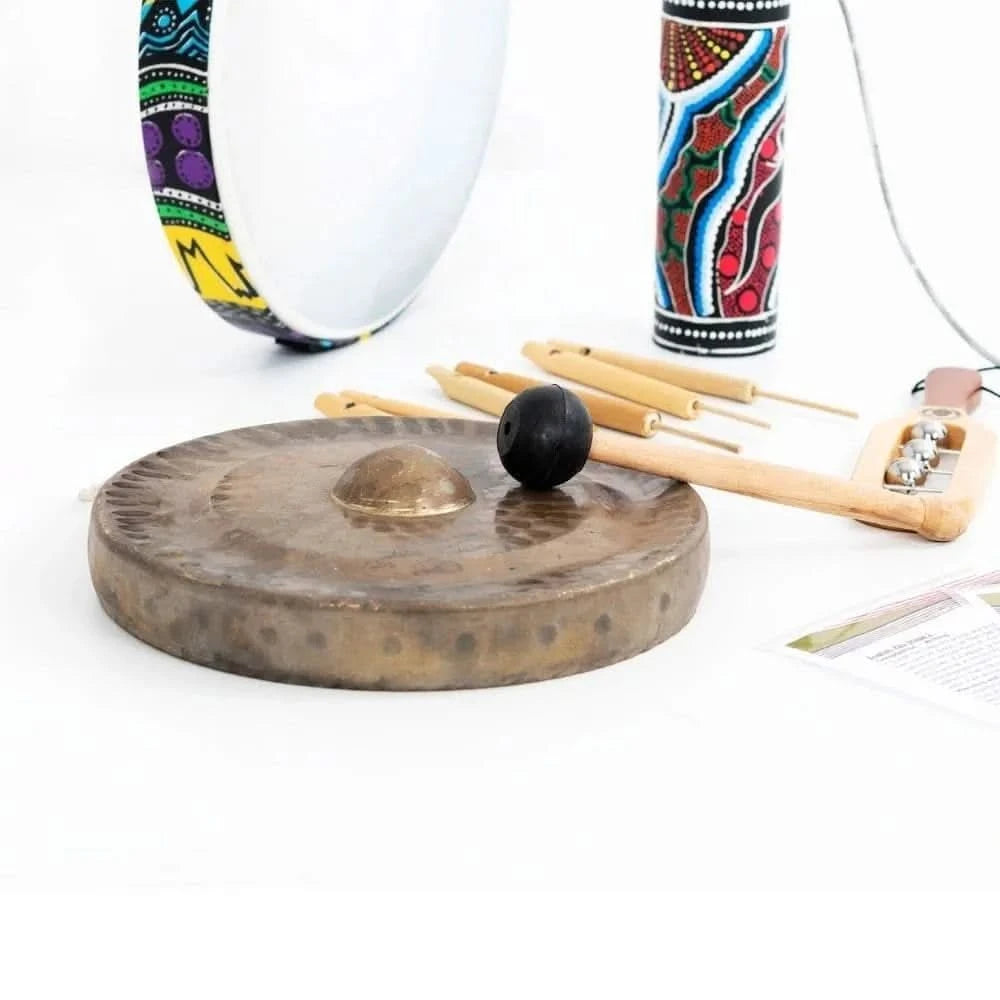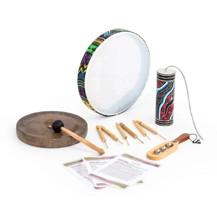 This pack typically contains 10 instruments, including an ocean drum, gong with beater, thunder shaker, 5 x bird whistles and a jingle stick. All items are hand crafted by independent makers using traditional materials and methods.