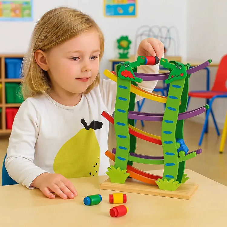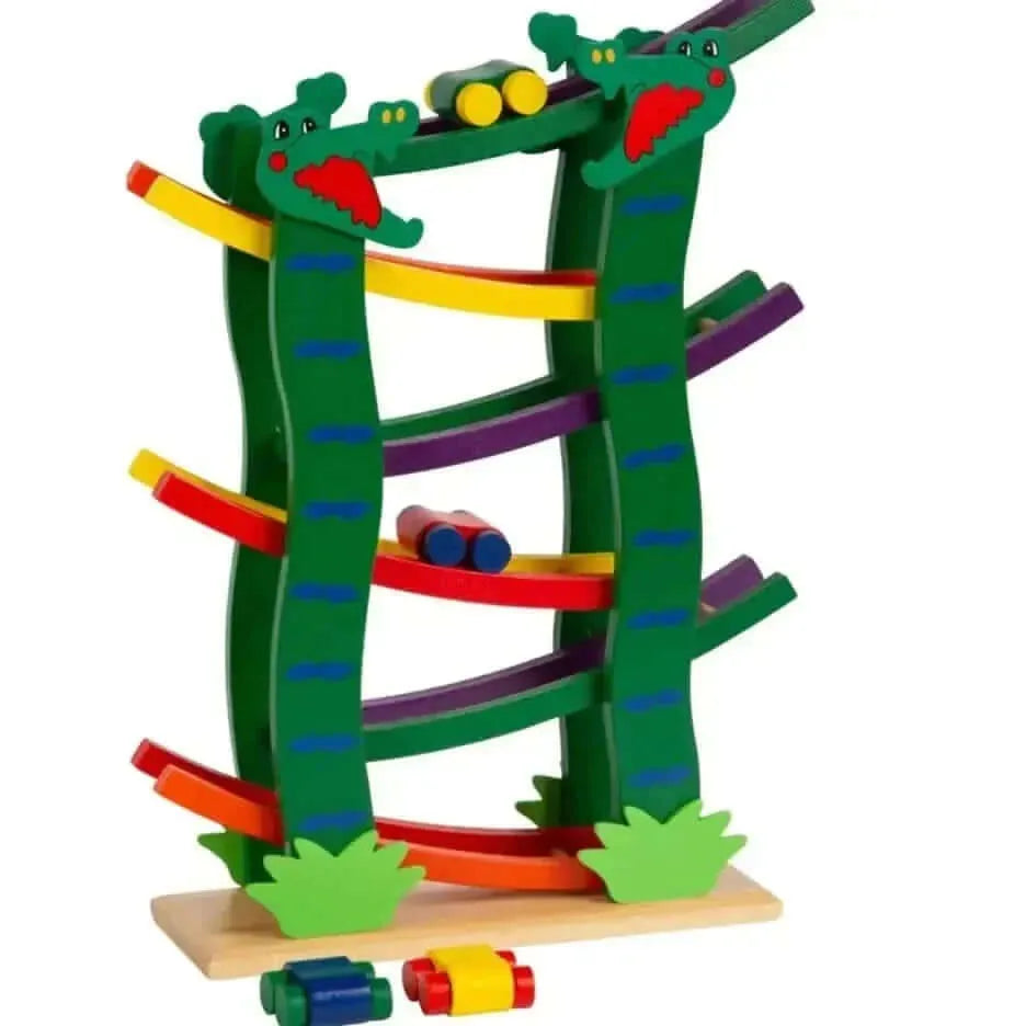 Introducing the Crocodile Wooden Track, a vibrant and uniquely designed racing adventure inspired by the thrilling dynamics of a marble run! This colourful wooden toy is more than just a track—it's a journey filled with speed, excitement, and endless fun. With its playful crocodile heads and eye-catching design, children will love sending the included cars zooming down the track and rolling over for continuous action.