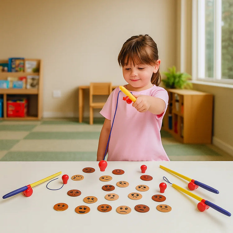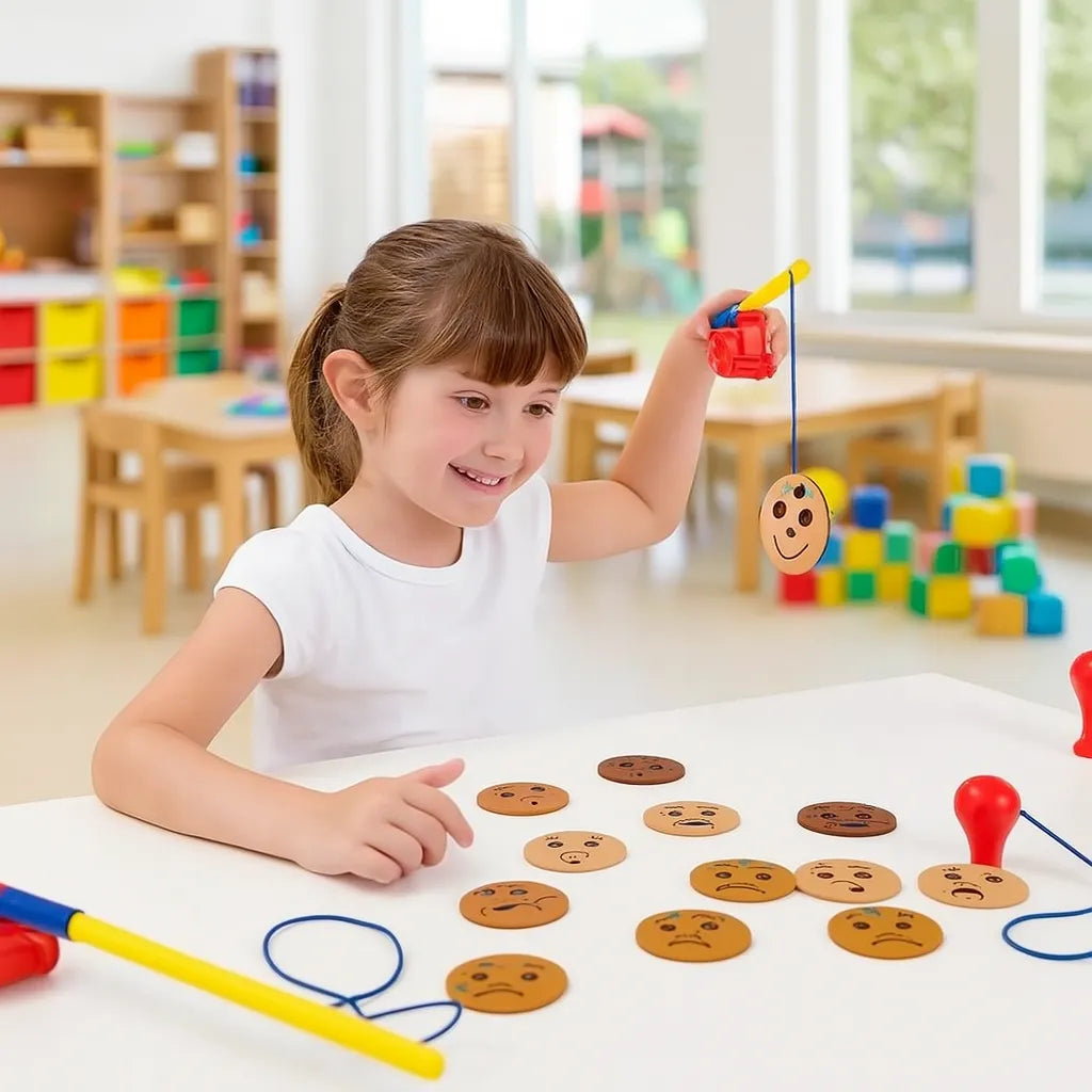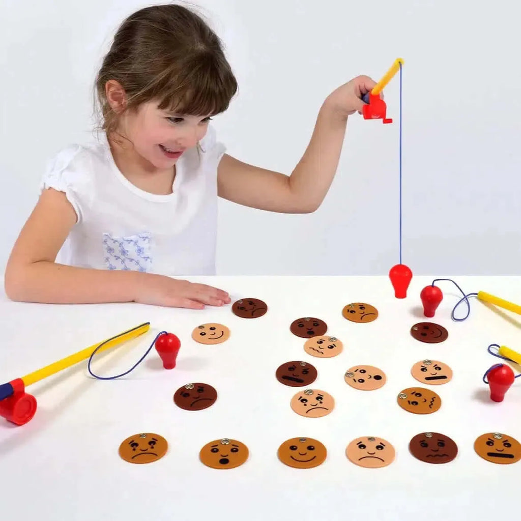 The Emotions Fishing Game is an engaging and educational activity designed to teach children about emotional recognition while developing key motor and social skills. Perfect for classrooms, therapy sessions, or home use, this interactive game combines fun with learning as up to four players "fish" for emotion face discs using magnetic fishing rods.