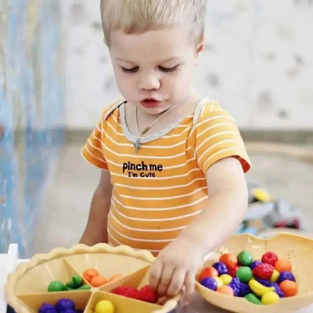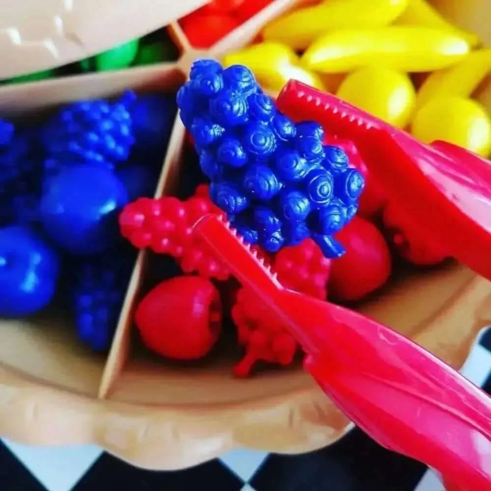 Picking up and sorting the fruits with the tweezers adds an exciting challenge to the activity. After sorting and counting, children can use the pie in imaginative play, serving their creations in a pretend kitchen for an extra layer of enjoyment.