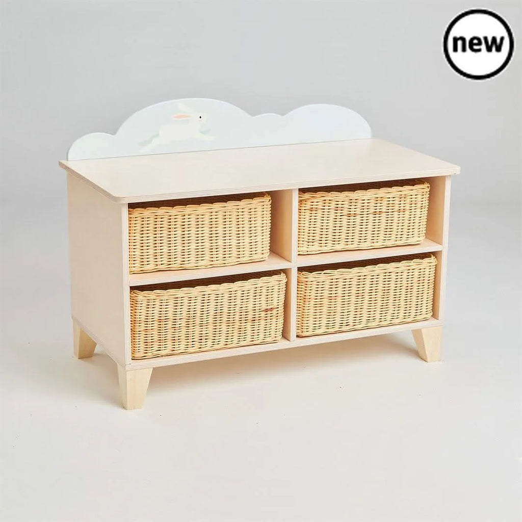 The Bunny Storage Unit features four handmade wicker baskets that are both practical and elegant. These removable baskets make tidying up a breeze, allowing you to store toys, books, and other items quickly. The unit also doubles as a handy bench, allowing children to take a break from playtime or sit while they read or relax.