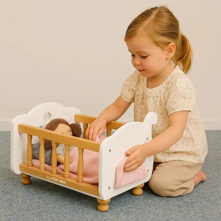 Perfectly sized to fit dolls and soft toys measuring approximately 25–30cm (12–14 inches), this adorable crib creates the perfect bedtime setting for pretend play adventures. Whether laying babies down for a nap, soothing them with a lullaby, or tucking in their favourite soft animals, children can explore empathy, responsibility, and comforting routines through meaningful role-play. This type of play helps build early social skills, emotional understanding, and language development—all while keeping little hands busy and imaginations thriving.