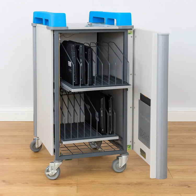 With the ability to charge all 16 devices simultaneously, the LapCabby 16v Charging Trolley offers both convenience and reliability. Its ergonomic design includes rubber corner bumpers for added protection, not only safeguarding the unit itself but also providing shock absorption for the laptops and Chromebooks inside. This makes it an ideal choice for ICT suites and shared learning environments where safety and durability are essential.