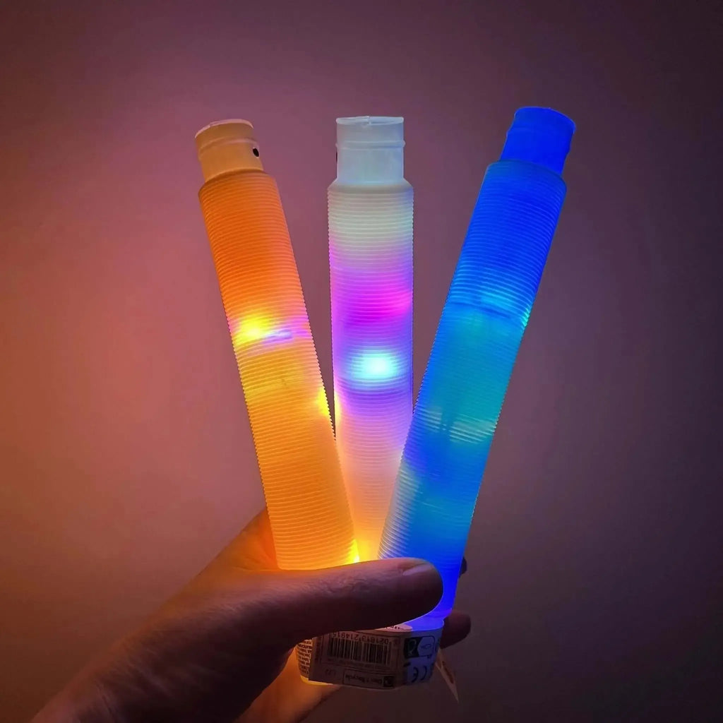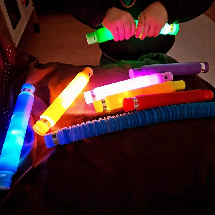 Each pack includes four vibrant pop tubes that expand, contract, and connect for hours of creative exploration. Stretch them up to 58cm long, twist them into shapes, or link them together to form longer tubes and imaginative structures. The built-in light-up feature adds a dynamic visual element, making these tubes perfect for both active play and calming sensory breaks.