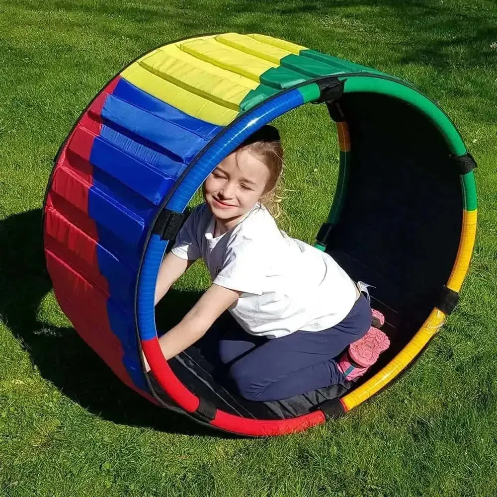 The wheel is sturdy and comfortable, wrapped in high-density nylon-covered foam padding. It's hoops easily attach with hook-and-loop fasteners, making it simple to assemble and use. This thoughtfully crafted design encourages children to climb inside and move the ring forward or backwards, promoting physical activity and exploration.