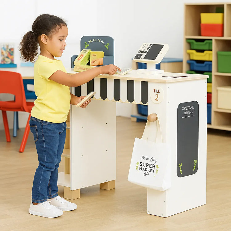 • Fine motor skills & hand-eye coordination – Scanning items, handling play money, and organising shelves enhance dexterity.