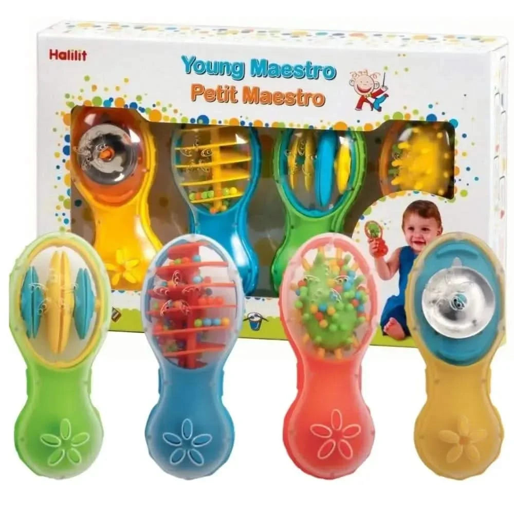 Introduce your little one to the magical world of music with the Halilit Young Maestro Gift Set. Designed for babies as young as six months, this gift set contains four vibrantly coloured shakers that offer a delightful sensory experience. These shakers not only help babies discover rhythm and sound but also stimulate their senses with bright colours, textures, and fun sounds.