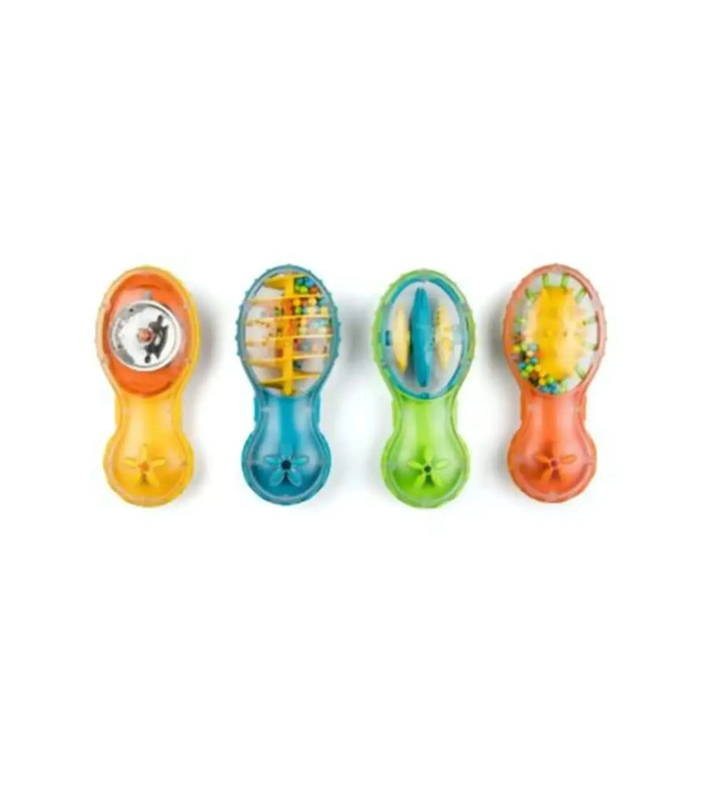 Diverse Sounds & Visual Stimulation: The set includes four different shakers, each with unique sounds and colourful designs. The Swirly Bead Shaker, Jingle Shaker, Spikey Bead Shaker, and Clip Clap Shaker all offer different auditory and visual experiences, engaging babies' hearing, sight, and touch.