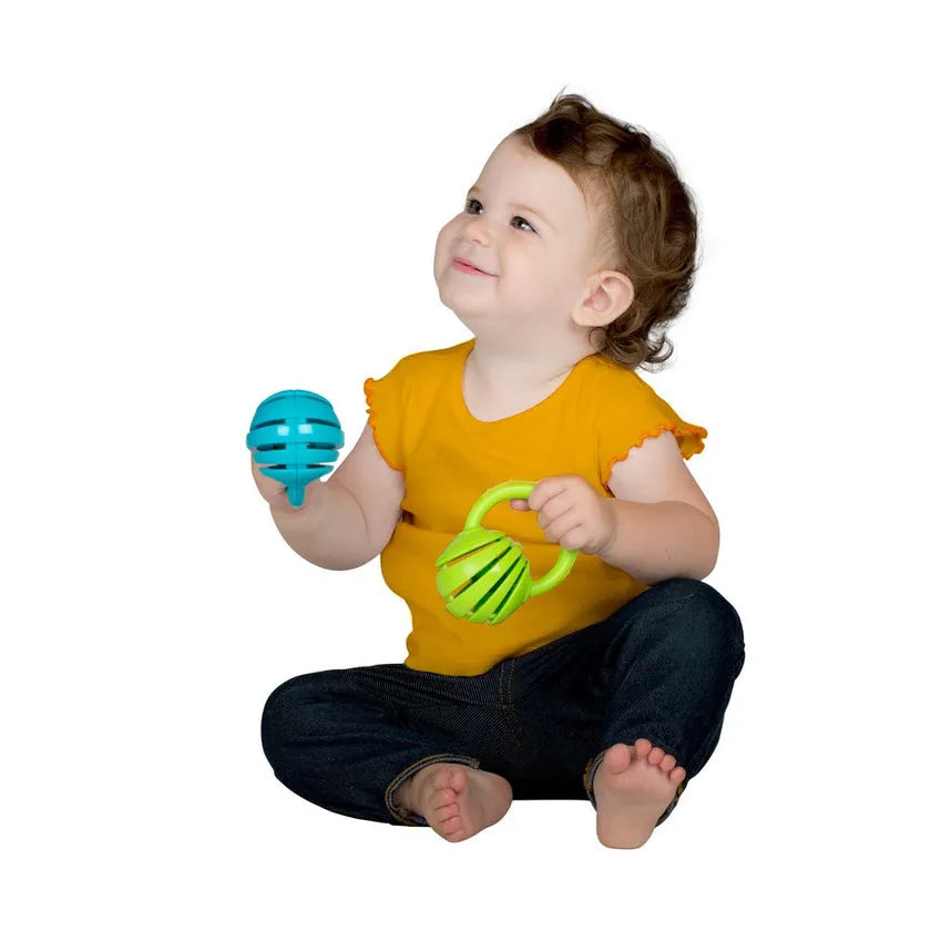 The bright, tropical colours encourage visual focus and tracking, while the gentle, rhythmic jingling sparks early auditory development. Babies can explore cause and effect as they shake the bells and hear the sound they create, laying the foundation for early musical awareness. The textured, ergonomic handle is perfect for small hands, helping to build fine motor skills, grip strength, and coordination through grasping and shaking.