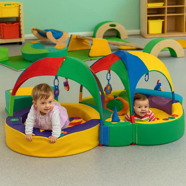 It surrounds a young baby with tactile, visual and sound stimulation, encouraging them to take notice and explore their surroundings.