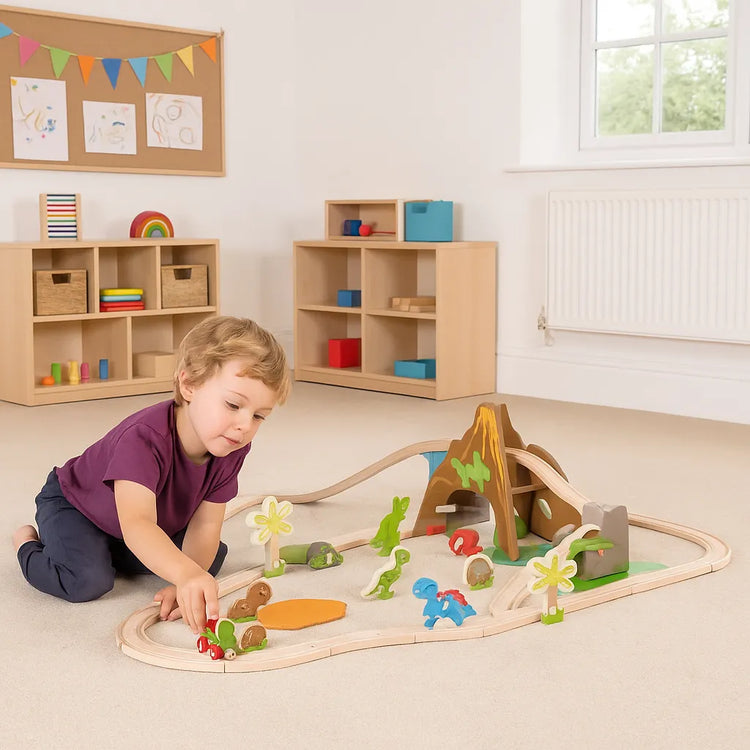 - Includes wooden tracks, a dinosaur railway engine and two carriages, volcano tunnels, a group of wooden dinosaurs and trees