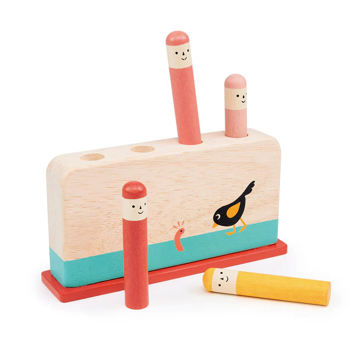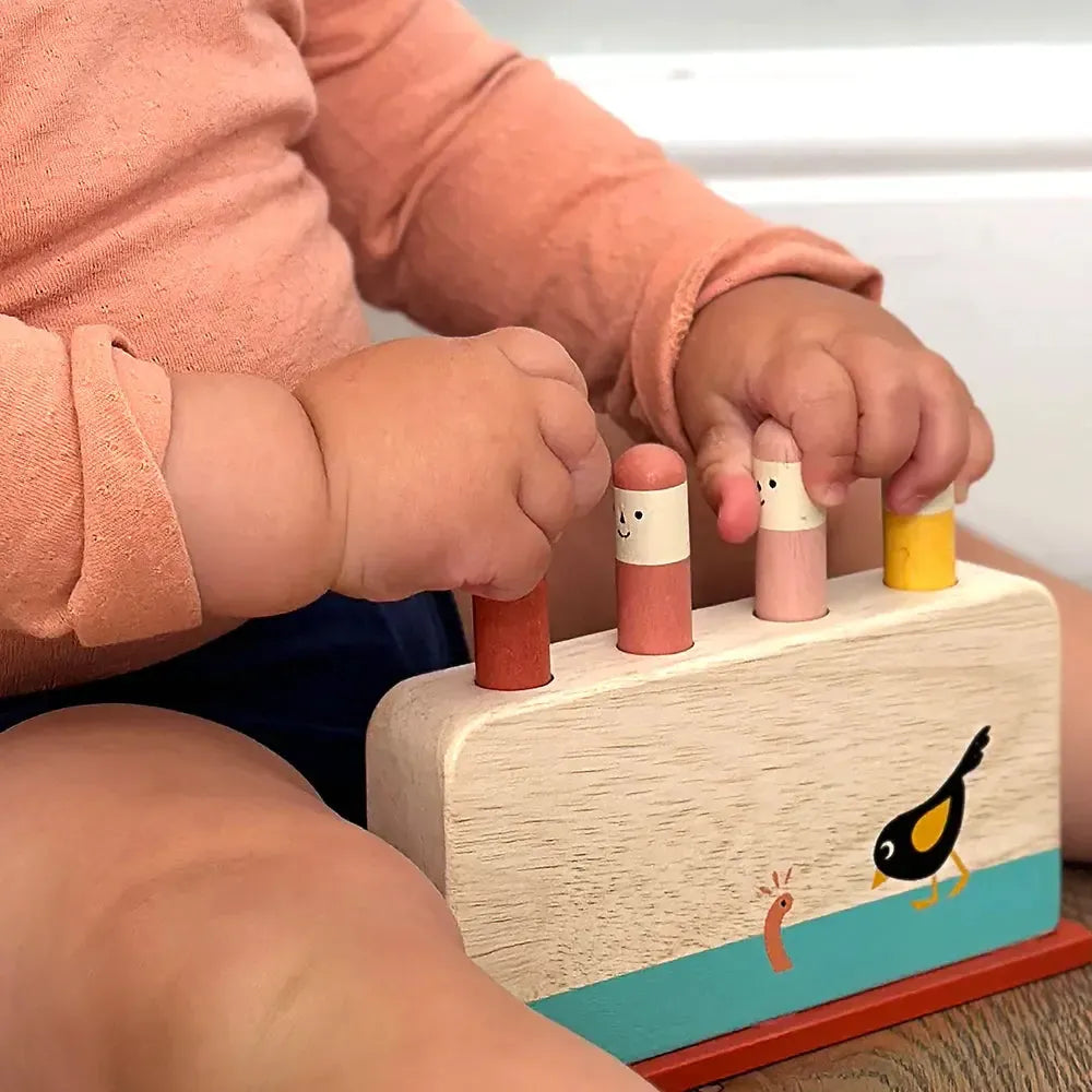The Early Bird Pop Up game by Mentari introduces young children to the joy of cause-and-effect through playful sensory exploration. With four chunky, rounded pegs designed as colourful garden worms, little hands can push them down and delight as they spring back up. This simple yet engaging activity stimulates hand–eye coordination, fine motor skills, and spatial awareness, while the cheerful bird illustration brings added charm to playtime.
