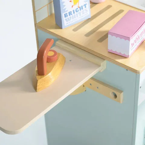 Wooden pretend play laundrette set with washing machine, sink, and ironing board.