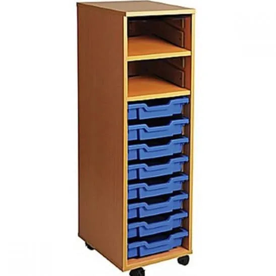 Crafted from durable 18 mm-thick melamine-faced chipboard (MFC), the unit is designed to withstand the demands of busy environments. It features two adjustable shelves for storing larger items and eight shallow Gratnells trays, ideal for smaller supplies such as markers, craft tools, and stationery. The trays are available in a variety of vibrant colours, including blue, red, green, or yellow, adding a cheerful touch to any space.